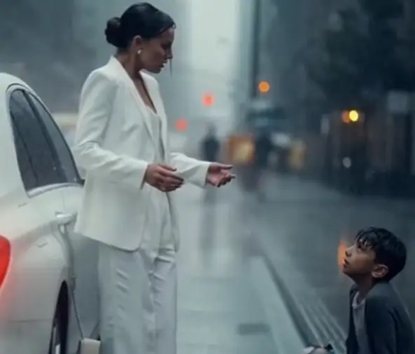 The sidewalks were crowded with umbrellas and rushing footsteps. She was just a few steps from the glass doors when a young boy, about nine years old, ran by holding a greasy paper bag of leftover food. His clothes were torn, soaked, and stained. His hair clung to his forehead. His eyes were tired—too tired for a child.