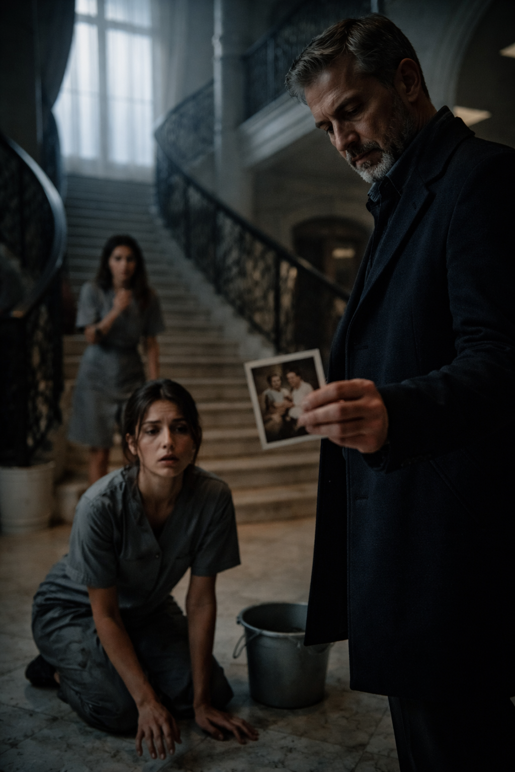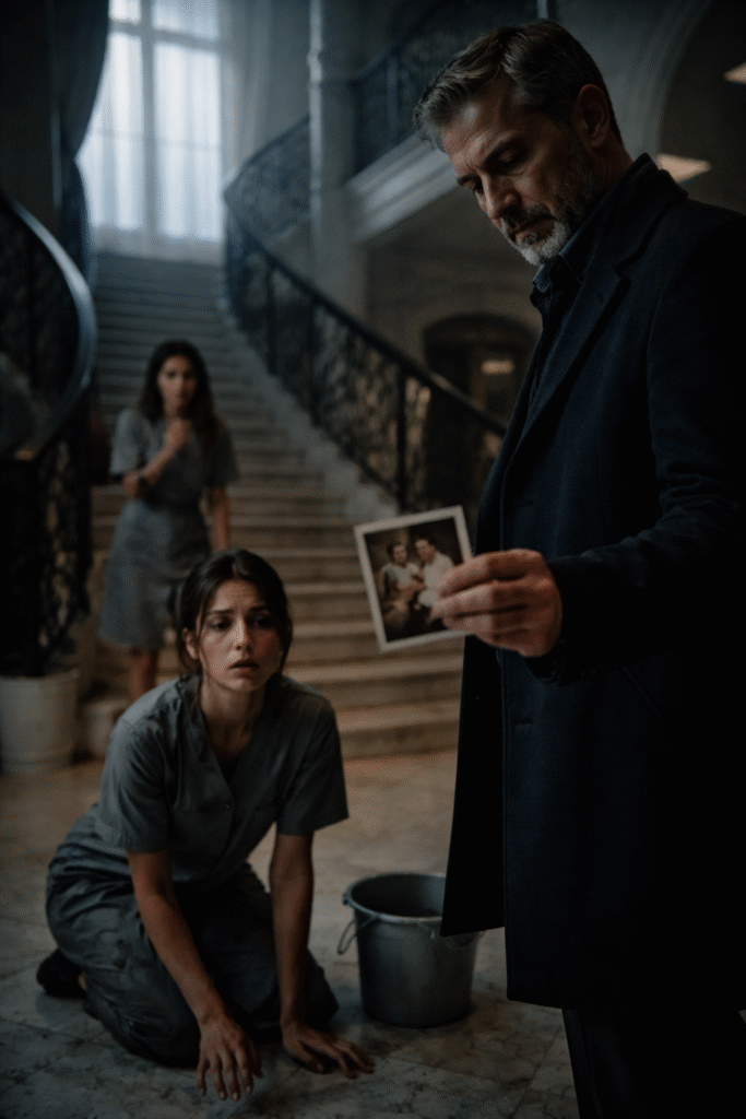 Emily retrocedió hacia la escalera, aferrándose al pasamanos. Sus ojos vacíos se movían entre él y la otra mujer, cuya sonrisa educada ahora era solo miedo congelado. El cubo gris se inclinó, derramando un hilo de agua sucia que resonó en el silencio absoluto.