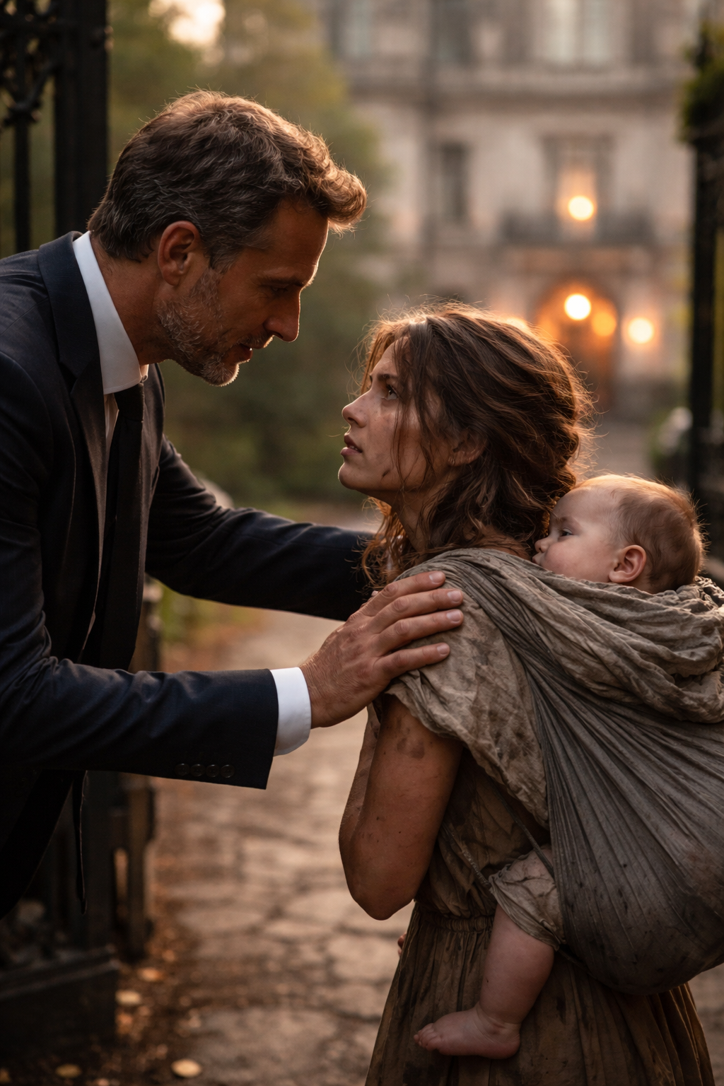Ă quarante-cinq ans, ce milliardaire londonien nâavait jamais Ă©tĂ© arrĂȘtĂ© net par une voix inconnue. Il sâapprĂȘtait Ă franchir les lourdes portes de sa somptueuse demeure quand il se retourna. Devant lui se tenait une jeune fille dâĂ peine dix-huit ans, vĂȘtue dâune robe dĂ©chirĂ©e, le visage maculĂ© de poussiĂšre et de fatigue. Dans son dos, serrĂ© contre elle dans un tissu usĂ©, dormait un nourrisson dont la respiration fragile semblait Ă peine exister.