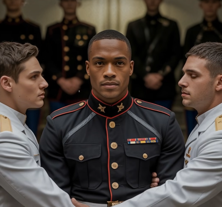 In this powerful courtroom-like moment, captured at a military graduation ceremony, a scene unfolded that no one present would ever forget. The image shows a highly decorated Black Marine, standing tall and composed, being confronted by two guards in pristine white uniforms. Behind them, other officers stand in attention, unaware that they are moments away from witnessing an extraordinary act of solidarity and respect.