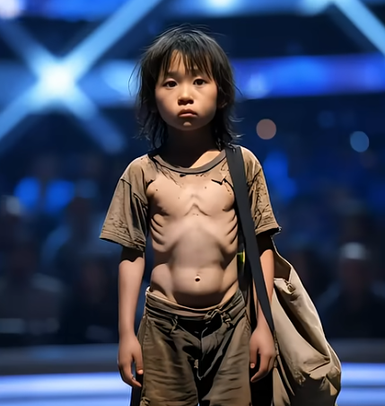 He stood there barefoot, under the blinding stage lights, his clothes torn, his small chest rising and falling in nervous rhythm. The audience murmured — some with curiosity, others with disbelief. A boy who looked no older than eight, holding nothing but a small bag slung across his shoulder, had stepped onto the biggest stage of his life.