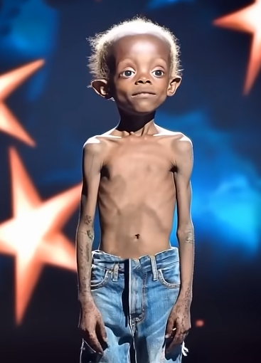The auditorium lights dimmed, and the judges leaned forward, expecting another act filled with energy, costumes, or music. But instead, what stepped onto the stage was a small boy — frail, thin, wearing oversized, torn jeans that slipped down his narrow frame. His bare chest revealed ribs that seemed to press against his skin, and his large, wide eyes scanned the room with a mixture of fear and determination.