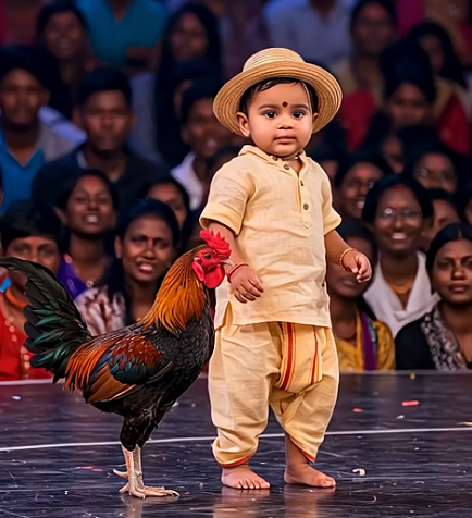 Halfway through, the baby stopped. He looked at his rooster and whispered something softly — no one could hear it, but the bird seemed to understand.
