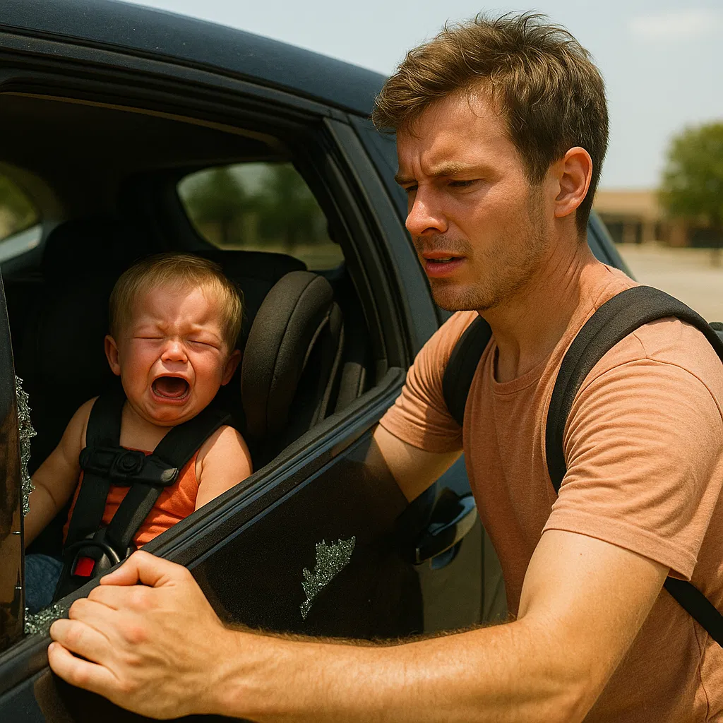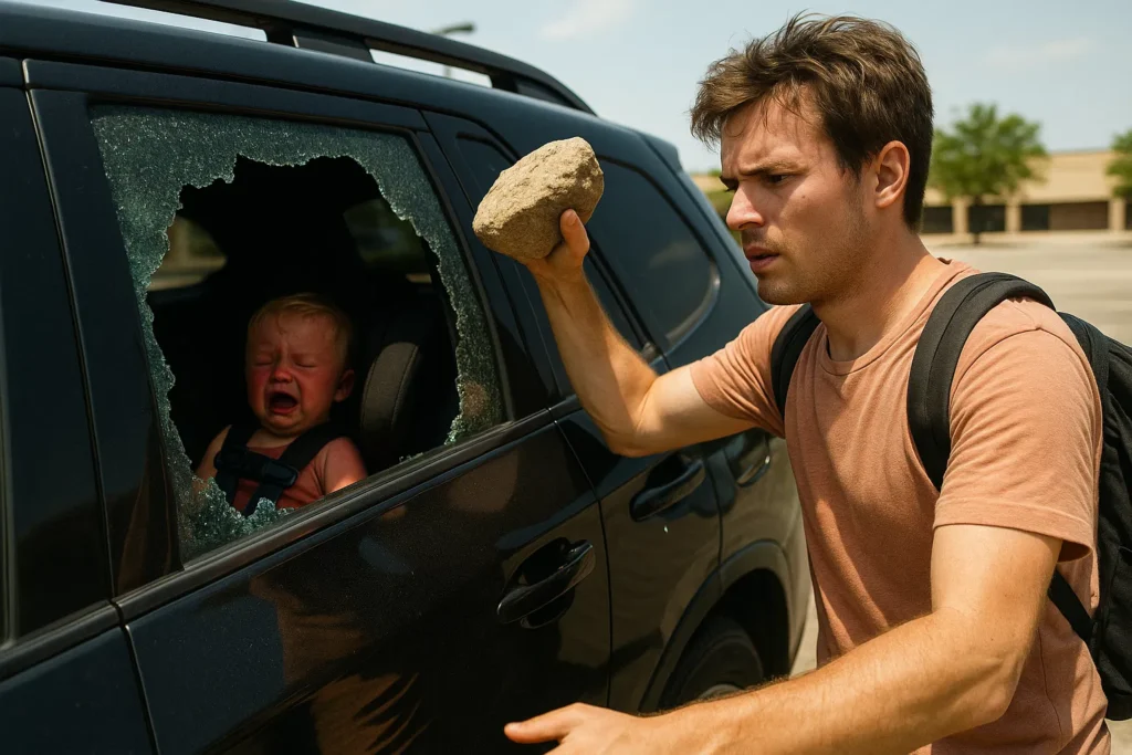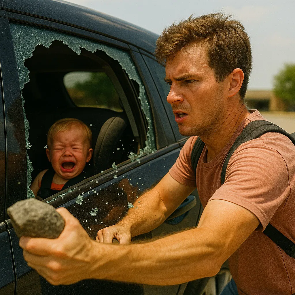 Without a second thought, Lucas grabbed a large landscaping rock from a nearby flowerbed, shouted, “I’m sorry, little guy,” and smashed the rear passenger window. The glass shattered with a loud crack. He reached in, carefully avoiding the shards, and unbuckled the baby from his seat. The child’s skin was hot to the touch—alarming.