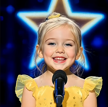 She stood there like a sunbeam made human — wrapped in a golden dress, her hands clasped sweetly in front of her, eyes wide and sparkling. Behind her, a glowing star lit the stage, but it wasn’t brighter than her smile. It wasn’t brighter than her.