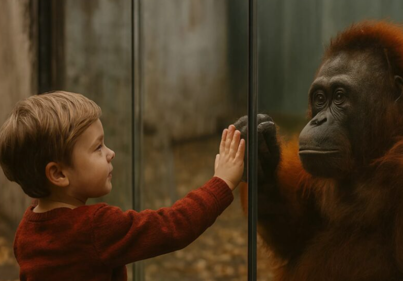 He darted off and ran to a large glass enclosure. Behind the thick glass sat a huge orangutan with dark, heavy eyes. The boy, feeling neither fear nor danger, pressed his little palm against the glass and waved cheerfully with the other hand.